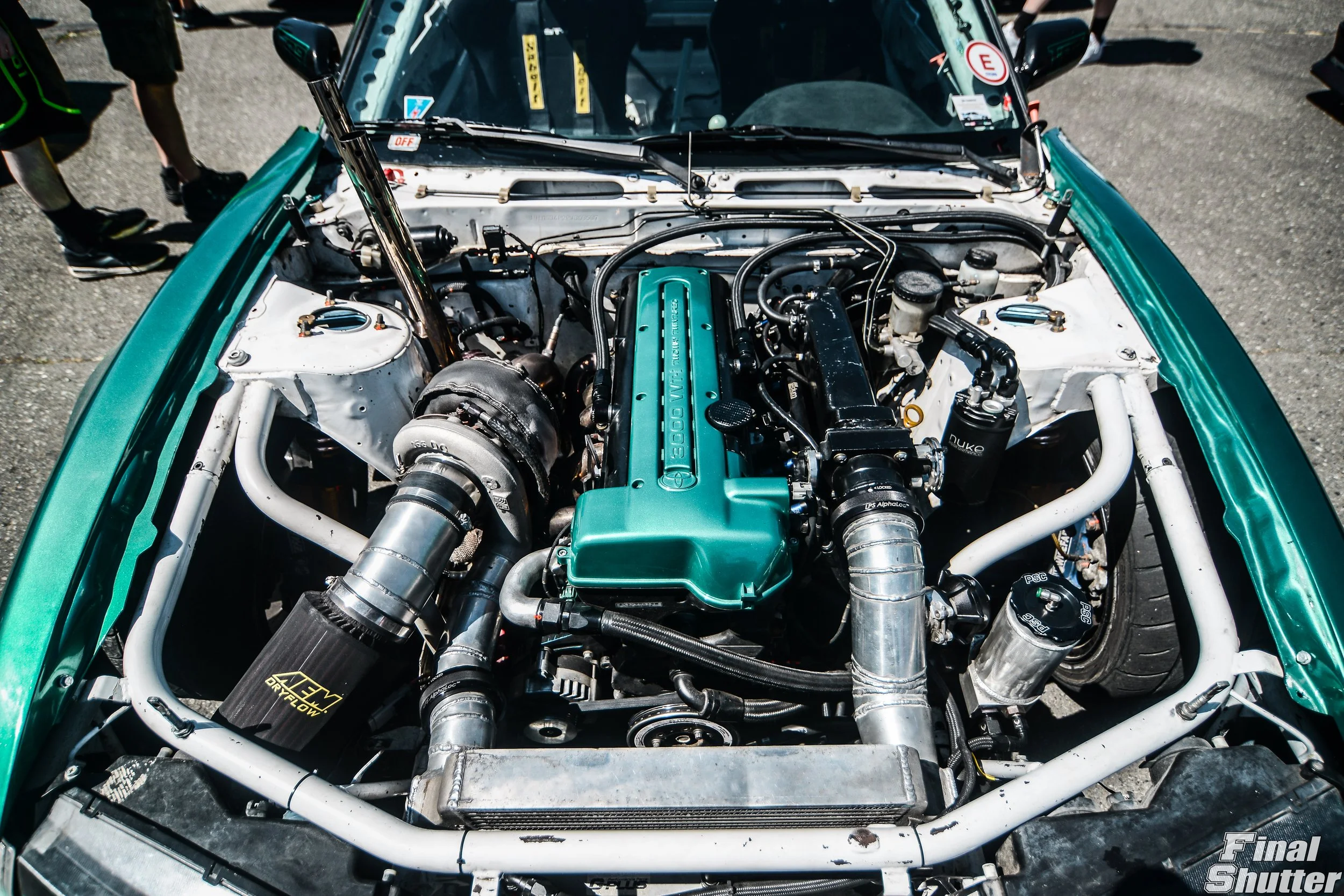 At a slight distance I thought to myself, “Oh cool another drift ready S Chassis on VS-KF’s…” until I got close to the engine and best believe I was stunned. A boosted K swap sitting nicely in the custom painted & welded bay.