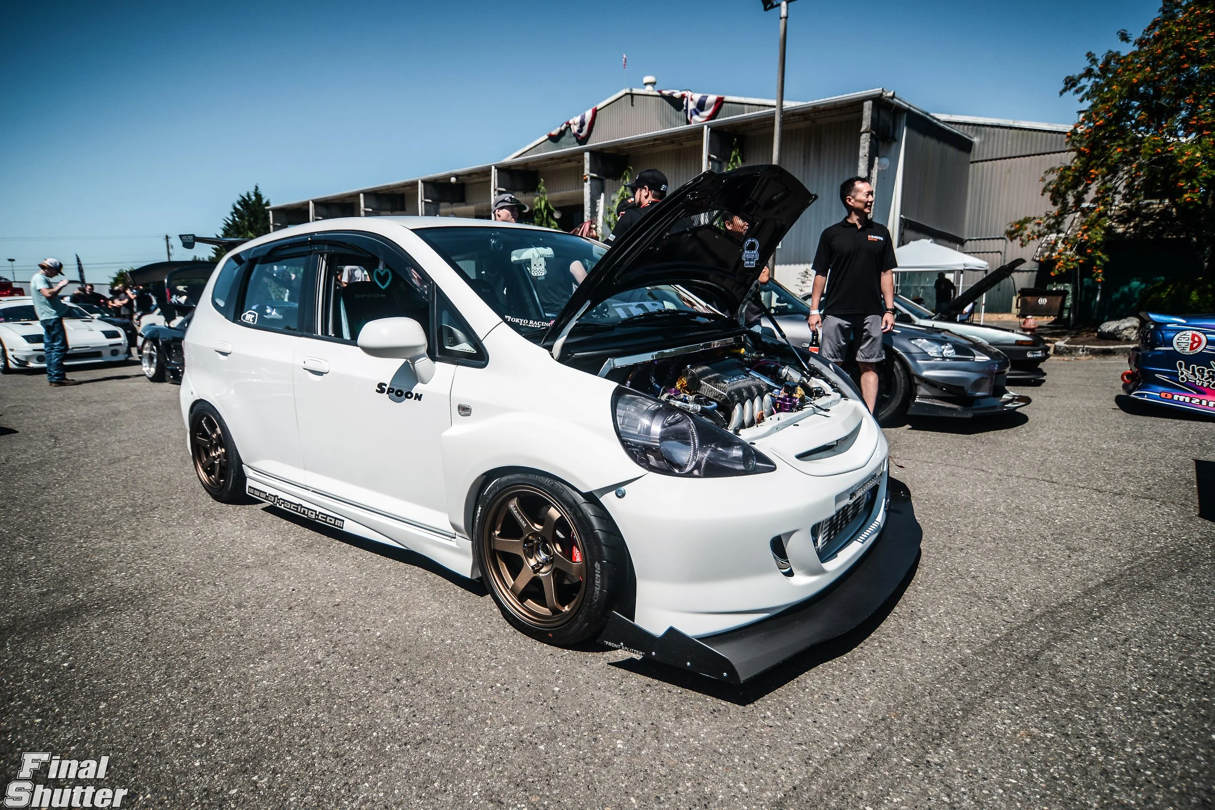 Daniel Yeh’s turbocharged GD3 Fit rocking some J’s Racing goodies and TE37 Sonic wheels. I seen this car at the recent Wekfest Seattle event for a quick glimpse, but didn’t get the chance to snap some photos of it. Good thing he came down again because this thing is pretty cool!