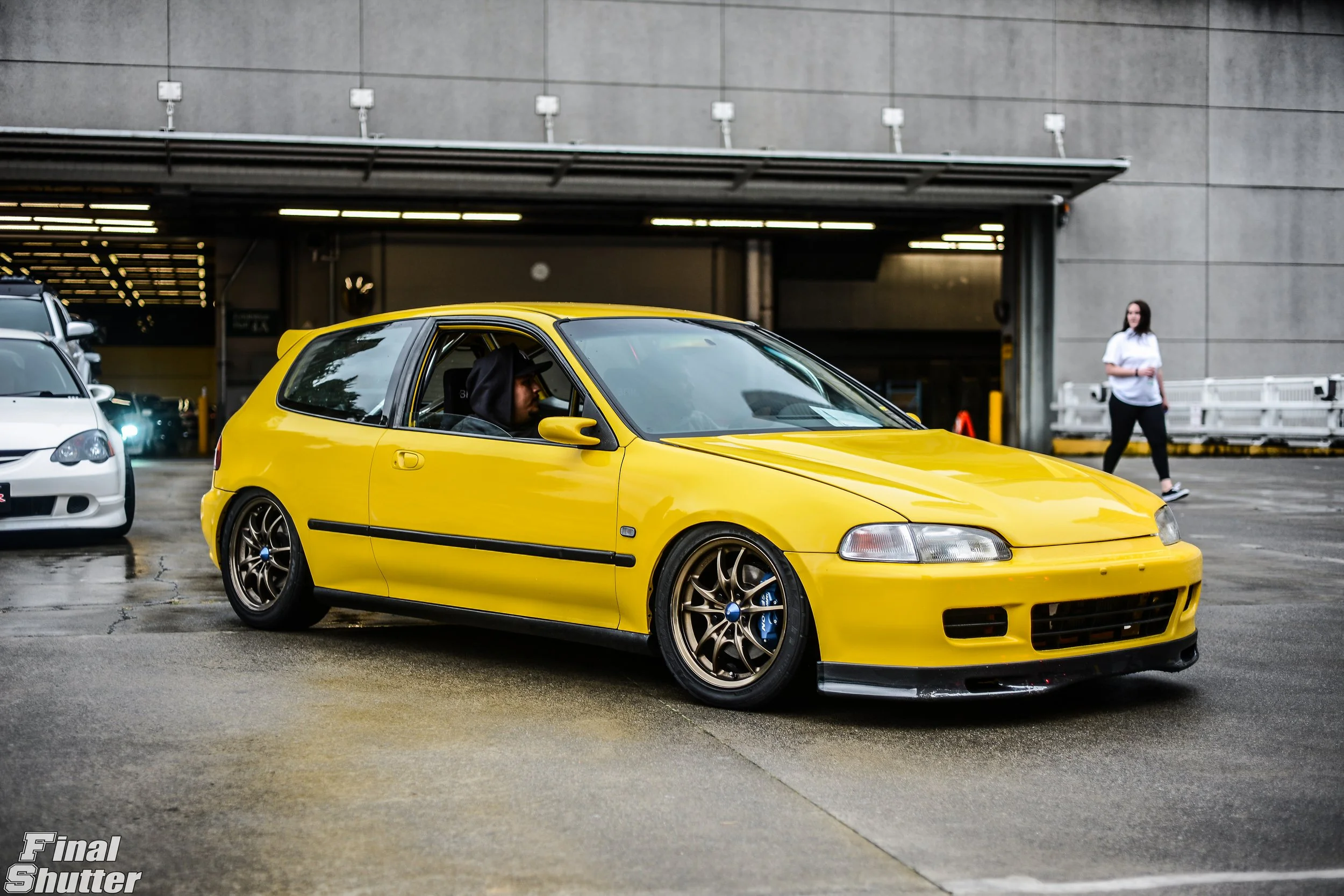 Carlos Garcia from the east pulled up with his EG3 hatch modded with a Sergeant bumper, First Molding lip, Bronze RE30’s, Spoon brakes, and the super rare yellow interior.